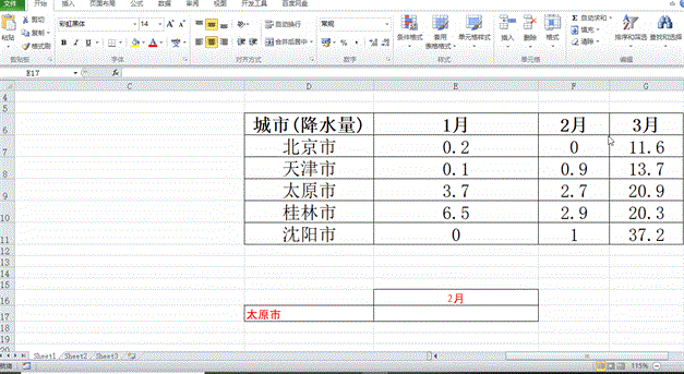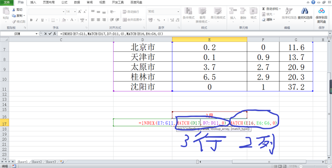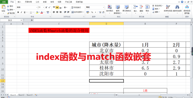我们看到这样的一个求值方式,我们求出来里面的题目要求,利用index函数和match函数嵌套非常容易能够得出来结果,得到了太原市二月份降水量的一个结果的,那我再给大家分析一下里面的嵌套函数match函数,是什么样的一个意思。给大家来讲解一下,上图。
