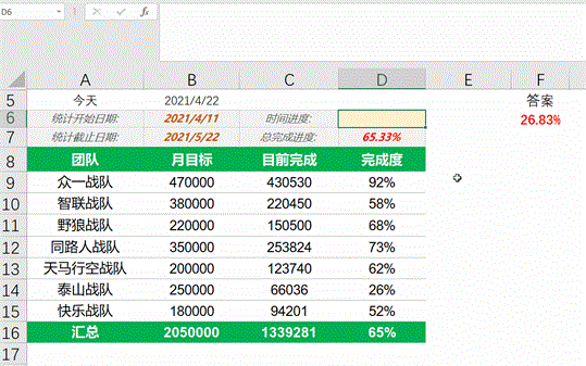 思路:利用datedif算出总需要的时间,然后利用today函数,算出到当前所用的时间,如果要算前一天的,则用=today()-1