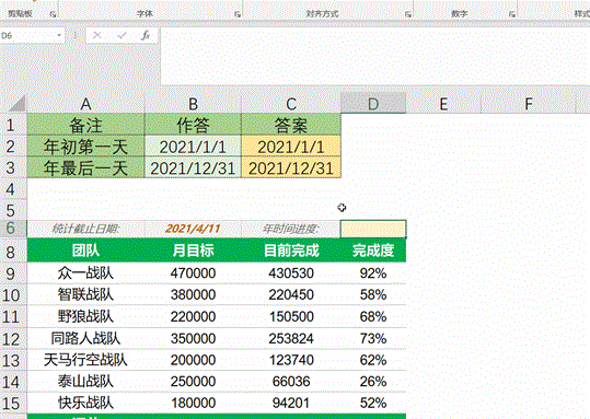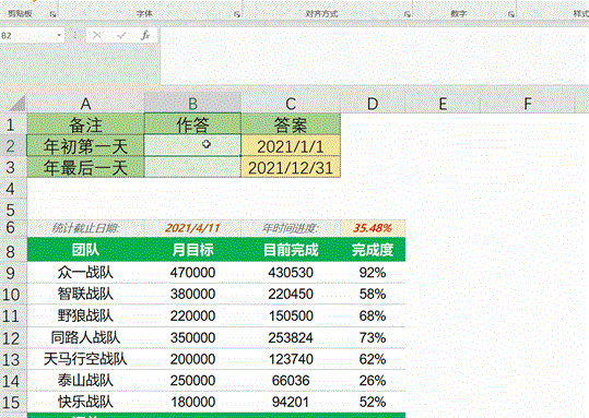 思路:先求出分母,本年第一天和最后一天(公式1:=DATE(YEAR(B6),1,1) /公式2:=DATE(YEAR(B6),12,31))
