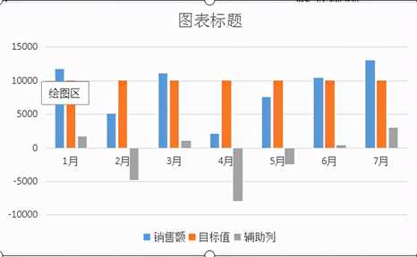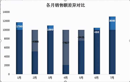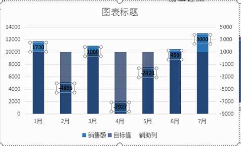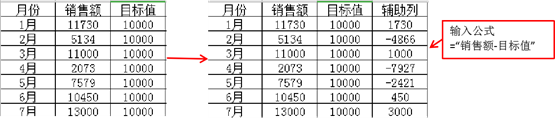在原始数据基础上,增加辅助列,输入公式:“=“销售额”-“目标值”。