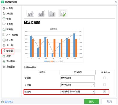 选中图表,右键—更改图表类型,辅助列更改为”带有数据标记的折线图”,并勾选”次坐标轴。