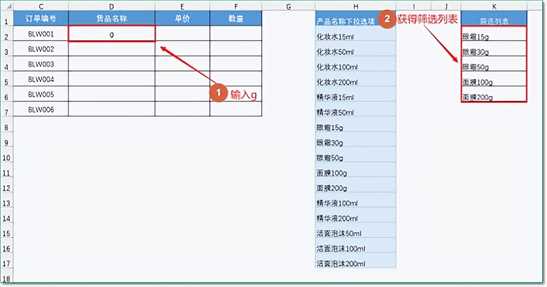 在D2单元格输入关键字的时候,可以通过公式,得到一个筛选列表。