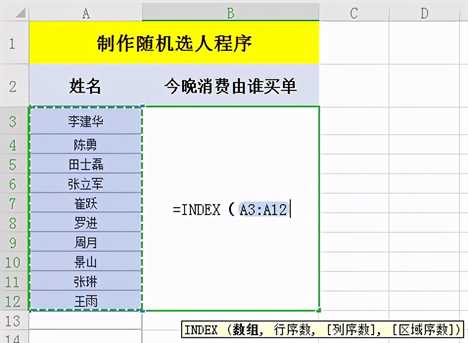 最佳答案操作方法:1、新建一个excel表格,在单元格A列输入所有候选人的姓名;在B2单元格中输入主题“今晚的消费由谁买单”;然后在下方多行合并2、在多行合并的单元格中,输入【=INDEX】3、然后在函数后输入左括号,鼠标点击A3单元格选中,再按快捷键【Ctrl+Shift+下箭头】,快速全选整个单元格。4......
