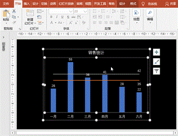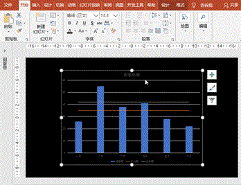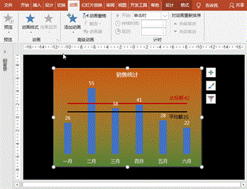 选择图表,执行“动画”菜单-“添加动画”-“进入”之“擦除”,设置“效果选项”序列为“按类别”,设置持续时间为2秒;点击“动画”-“高级动画”-“动画窗格”按钮,打开动画窗格,点开向下的箭头,分别设置背景、柱形图、平均线、达标线的效果选项之方向为自顶部、自底部、自左侧和自左侧。