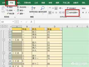 步骤4:点击“合并后居中”,将年级左侧的空白单元格合并。