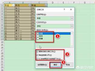 步骤1:选中数据所在单元格,点击“数据”——“分类汇总”,选择汇总项为“年级”,并选中图中的三个汇总设置项。这样就可以得到一份分类汇总的结果。