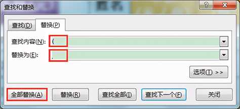 在“查找内容”编辑框中输入左括号“(”;在“替换为”编辑框中同时按Ctrl+J组合键输入一个换行符,编辑框中会出现一个闪烁的小黑点,接下来再输入一个左括号“(”。输入左括号后,可能我们会看不到左括号,但其实编辑框中是存在的。最后,单击“全部替换”按钮。