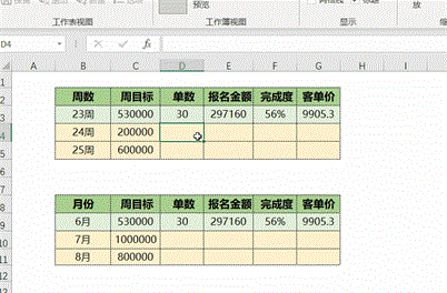 第二步:对报名单数和报名金额,分别按周和月进行汇总;求出完成度及客单价