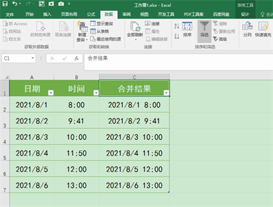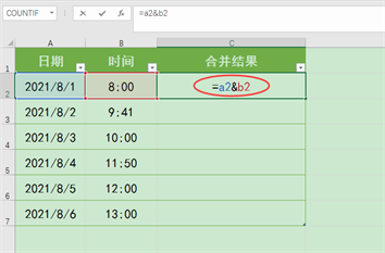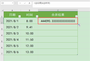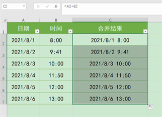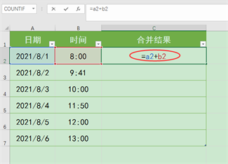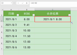 C2单元格,输入公式:“=a2+b2”,再按回车键确认公式,返回结果为“2021/8/1 8:00”,与我们预期的显示效果相符。接下来向下填充公式至C7单元格,即可将所有A列中的日期与B列中同一行对应的时间进行批量合并。