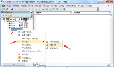 第二步:点击左边工程窗口,鼠标右键点击Thisworkbook,点击插入—模块。双击模块,进入我们的工作簿模块编辑窗口,如下图所示: