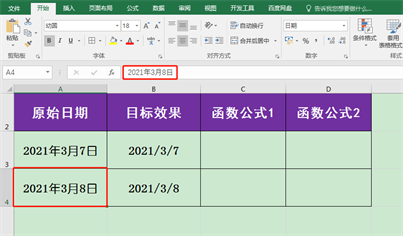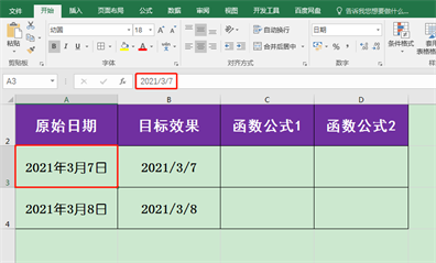出现这种情况是因为A4单元格中的长日期并非真正的日期格式,而是文本格式,我们可以通过查看表格上方的编辑栏进行判断。选中A3单元格,编辑栏中显示的是对应的短日期“2021/3/7”,而选中A4单元格,编辑栏中显示的是文本“2021年3月8日”。
