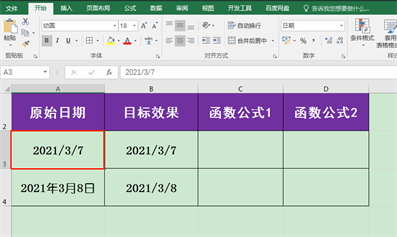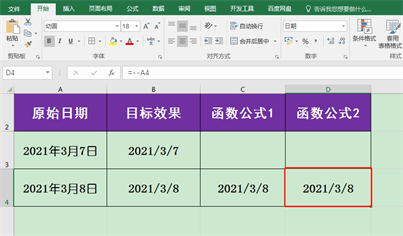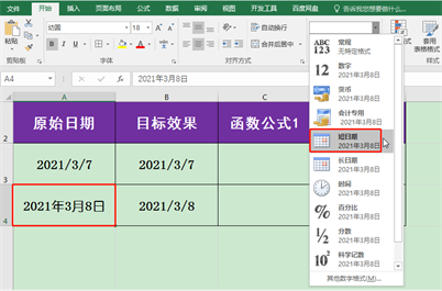 但是,有时候我们可能会遇到无法成功转换的情况,比如A4单元格中的长日期“2021年3月8日”。我们选中A4单元格,在数字格式下拉列表中选择“短日期”以后,A4单元格中的日期格式并没有发生相应的改变。