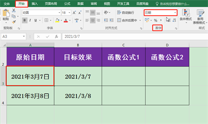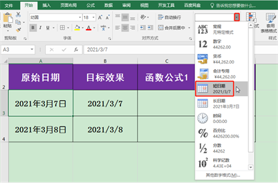 比如我们要将下图工作表A3单元格中的长日期“2021年3月7日”显示为B3单元格中的短日期“2021/3/7”,只需要选中A3单元格,在“开始”选项卡“数字”功能组中的数字格式编辑框中单击右侧的下拉按钮,在下拉列表中选择“短日期”格式即可。