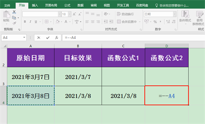 选中E4单元格,输入公式=– A4,按回车键确认公式,同样也返回了我们想要的短日期。