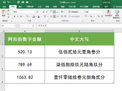 将下图工作表A列中的阿拉伯数字金额批量转换为中文大写金额,转换后的效果参见B列。