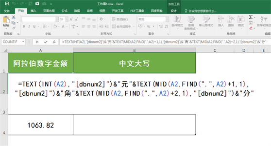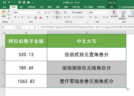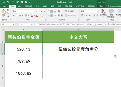 1公式中的INT(A2)作用是将A2单元格中的数值向下取整,[dbnum2]是中文大写数字的格式代码,所以TEXT(INT(A2),”[dbnum2]”)的作用就是将A2单元格中的数值520.13向下取整得到520后再将520转换为中文大写形式。
