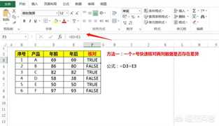 说明:在这种两列数据位置相同的情况下,我们直接用=等号来进行判断就可以核对到,如果数量不相同的会显示为False,相同的会显示为True。