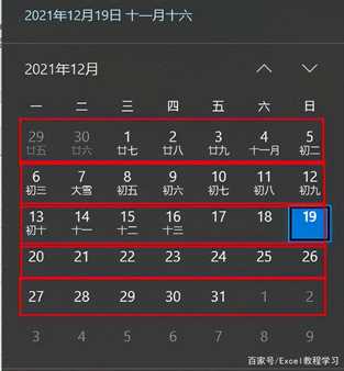 从下图中得知,12月1日是星期3,并不是星期1,但日历中当月第一周实际还是从周一开始的,所以我们要往回追溯到第一周周一的时间。