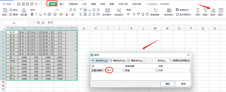 鼠标选中A到F列,选中开始-排序-自定义排序,选择按照列F排序,点击确定。