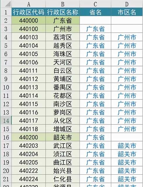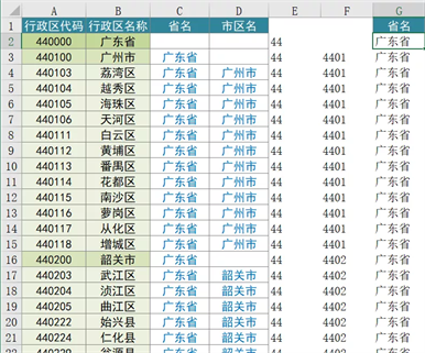 通过E2分离出省级代码,然后利用vlookup函数进行逆向查询。vlookup函数的特性是只查询出第一个值,也就是我们要找的省份代码。如此我们就分离出省份。