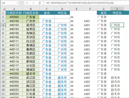 然后我们再进行分城市:H3=IF(–RIGHT(A3,2)=0,””,VLOOKUP(F2,IF({1,0},F3:F272,D3:D272),2,0))