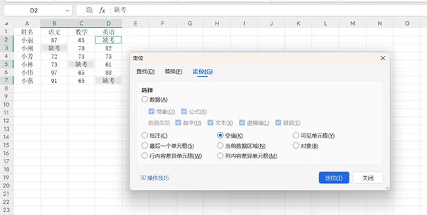 当需要给一片空白区域填充相同内容(如“缺考”)时,无需逐个输入。操作步骤很简单:先选中目标数据区域,按F5调出定位窗口,点击【定位条件】并选择【空值】,确定后所有空白单元格会被选中;接着直接输入“缺考”,最后按下【Ctrl+回车】,所有空白单元格就会瞬间填满内容,省时又省力。