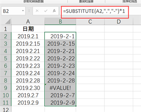 如下图所示,添加辅助列,在辅助列输入公式=SUBSTITUTE(A2,”.”,”-“)*1,然后向下填充即可