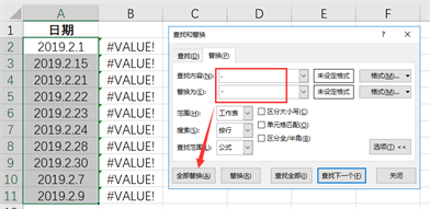 选择单元格区域,按Ctrl+F或者Ctrl+H组合键,打开“查找和替换”对话框,在“查找内容”右侧的文本输入框中输入“.”,在“替换为”右侧的文本输入框中输入“-”(或者“/”),注意不要勾选“单元格匹配”复选框,设置完成后点击左下角的“全部替换”