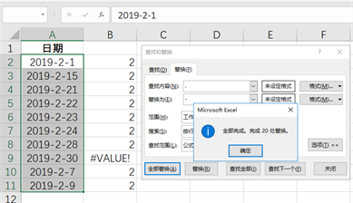 替换完成后,系统会弹出“全部完成。完成x处替换”的提示框,点确定按钮即可。返回工作表中,即可以看到假日期已经变成了真日期,B列的计算也可以完成。