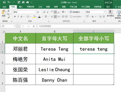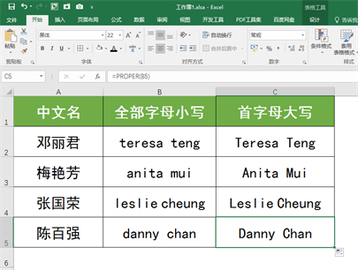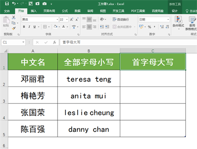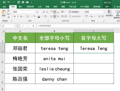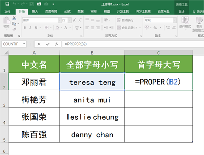 选中C2单元格,在英文状态下输入公式:=PROPER(B2),回车确认公式,即可将邓丽君的英文名变成首字母大写的形式。再将公式向下填充,就能快速将所有人的英文名全部变成首字母大写的形式。