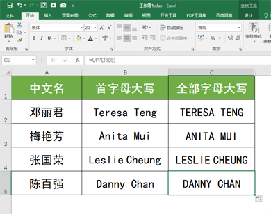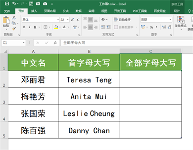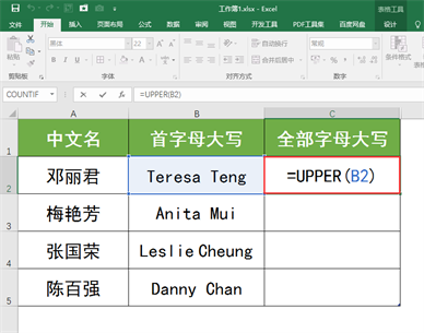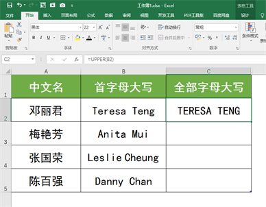选中C2单元格,在英文状态下输入公式:=UPPER(B2),回车确认公式,即可将邓丽君英文名中的字母全部变成大写。再将公式向下填充,就能快速将所有人的英文名字母全部变成大写。