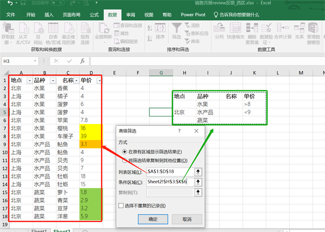 最佳答案第一步:建立一个我们需要的目标条件,图中我们选择了3个目标筛选的条件其一:水果>8其二:北京 水产品 <9其三:蔬菜这就表示,所有符合以上三个条件中的其中任何一个都是我们的目标筛选值。第二步:选择高级筛选,列表区域框中目标筛选区域,条件区域框中我们设置好的条件,然后确认就好了。第三步:看结果吧,是不......