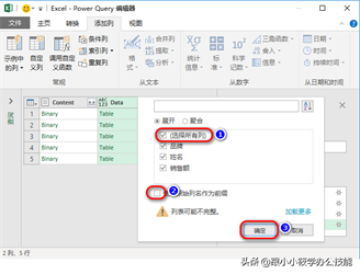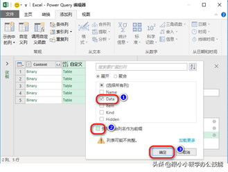 10、可以看到这一列的列名就变成“Data”了,而不是“自定义”– 再次点击“Data”右边的“扩展”按钮 — 在“选择所有列”前面的复选框打钩,不勾选“使用原始列名作为前缀”前面的复选框 — 点击“确定”按钮。