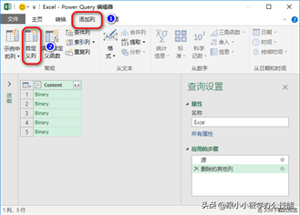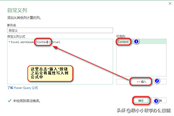 8、弹出“自定义列”对话框 — 在“自定义列公式”中输入公式“=Excel.Workbook([Content],true)”– 其中Content值为“可用列”点击插入的 — 点击“确定”按钮。