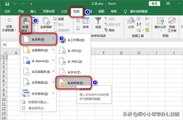 1、新建一个空白的工作簿并打开 — 在“获取和转换”工具组中点击“新建查询”的下拉三角 — 在下拉菜单中选择“从文件”–“从文件夹”。