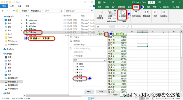 14、如果我们在文件夹内创建一个工作簿,回到汇总表里面,点击菜单栏的“数据”选项卡 — 在“连接”工具组中点击“全部刷新”– 然后点击“品牌”右边的“筛选”按钮 — 可以看到我们新创建的工作簿自动汇总到这个表中。