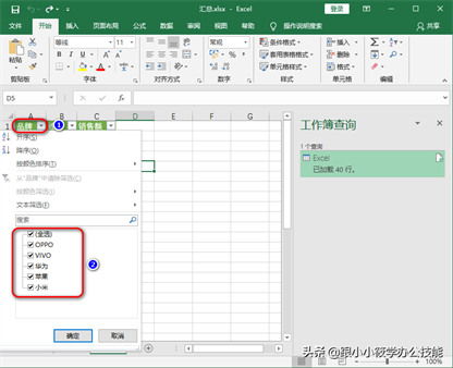 13、以上步骤操作完成之后,可以看到5个工作簿的数据都汇总到一个工作表中了。点击“品牌”右边的筛选按钮 — 里面就可以看到这5个表的数据。