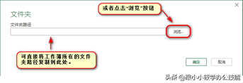 2、弹出“文件夹”对话框 — 可以直接将工作簿所在的文件夹路径复制到文本框中,或者点击“浏览”按钮。