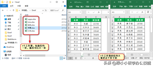 下图的Excel文件夹里面,放置了5个工作簿,每个工作簿里面的数据结构一样,但标题的顺序可以不一样。