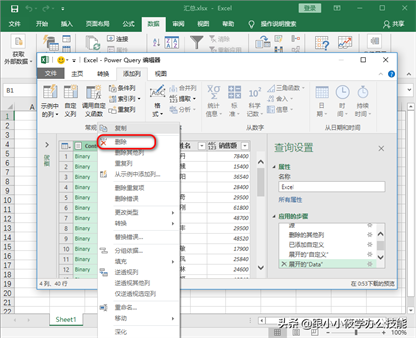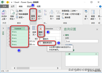 6、弹出“Power Query 编辑器”对话框 — 选中“Content”列 — 点击“管理列”– 点击“删除列”–“删除其他列”。