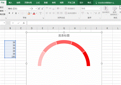 然后选中所有的数据,插入一个环形图,选中数据区,按ctrl+1后,旋转270度。将180数据所在部分改为无填充,让它成为半环图。