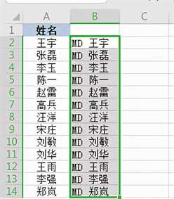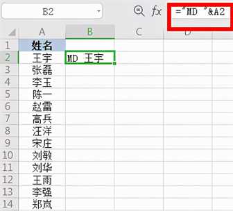 首先我们在B2单元格中输入【=”MD “&A2】,(MD后输入一个空格、“Shift+7”即可输入”&”)后按回车;