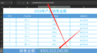 下面我们利用SUMPRODUCT函数来验证一下是否正确。利用SUMPRODUCT函数求总销售额的具体公式为:=SUMPRODUCT(C3:C9,D3:D9)