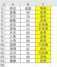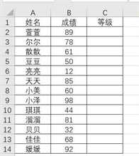 假设下面是我们现在拥有原始的数据表格图一,即学生的成绩汇总,可以看到列A是学生姓名,列B是具体的成绩,列C就是我们要填写的成绩类别了。