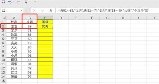 以原始表格中第一位学生萱萱的成绩为例,我们需要判断,萱萱的成绩,即B2单元格的值。如果B2大于85分,就显示优秀,如果B2在85分到74分之间就显示良好,如果B2在74分到60分之间,就显示及格,如果B2小于60分就显示不及格。