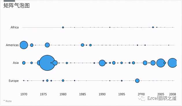 今天介绍的矩阵气泡图,则是直接把表格对应转换为气泡图,几乎是一种万能图表。为什么说它是万能图表,因为当你不知道做什么图好时,使用矩阵气泡图,几乎都可以过,它就是个图表化的表格,读者也很好理解。