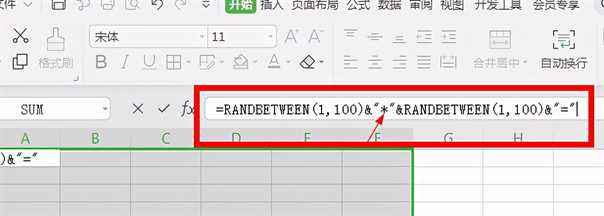 接下来在编辑栏内输入“【=RANDBETWEEN(1,100)&”*”&RANDBETWEEN(1,100)&”=”】;
