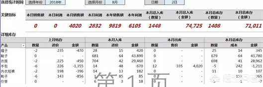 这是进销存报表的核心,在这个表中,序号展示出每日的关键销售指标、每月的关键销售指标和详细的库存情况,并且这些数据都可以通过时间来进行筛选。