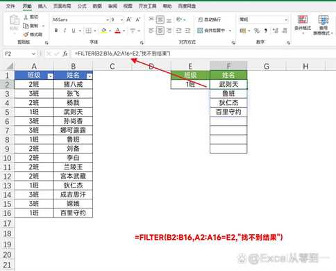 如下图所示,我们想要找到1班对应的所有姓名,只需要将公式设置为 =FILTER(B2:B16,A2:A16=E2,”找不到结果”)