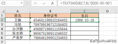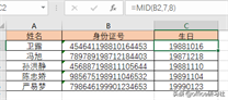 其中,MID 函数提取身份证中代表生日的数字,即处在第7至14位的数字。